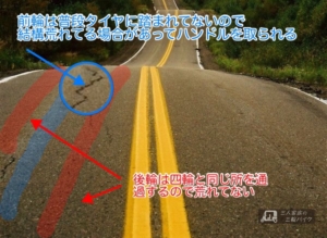 APtrikes125で走行していると路面ギャップを前輪が拾い、ガタガタとハンドルを取られてしまいます。