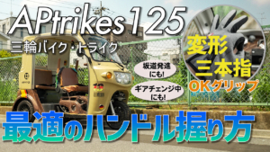 バイクのブレーキやクラッチの握り方、指の掛け方には、4本派、2本派、1本派などバイクの車格や走る場面などで色々な流派があるのですが、バイクと違い3輪で安定性のあるAPtrikes125では、ニーグリップなどの必要もないですし、好きな形でグリップすれば良いとは思うのですが、走行時の路面ギャップでハンドルがガタガタする点、ギアチェンジする際に右手1本になってしまう点で4本で握るより、ハンドルを支える力が強い握り方が向いていると思います。