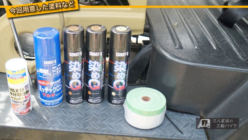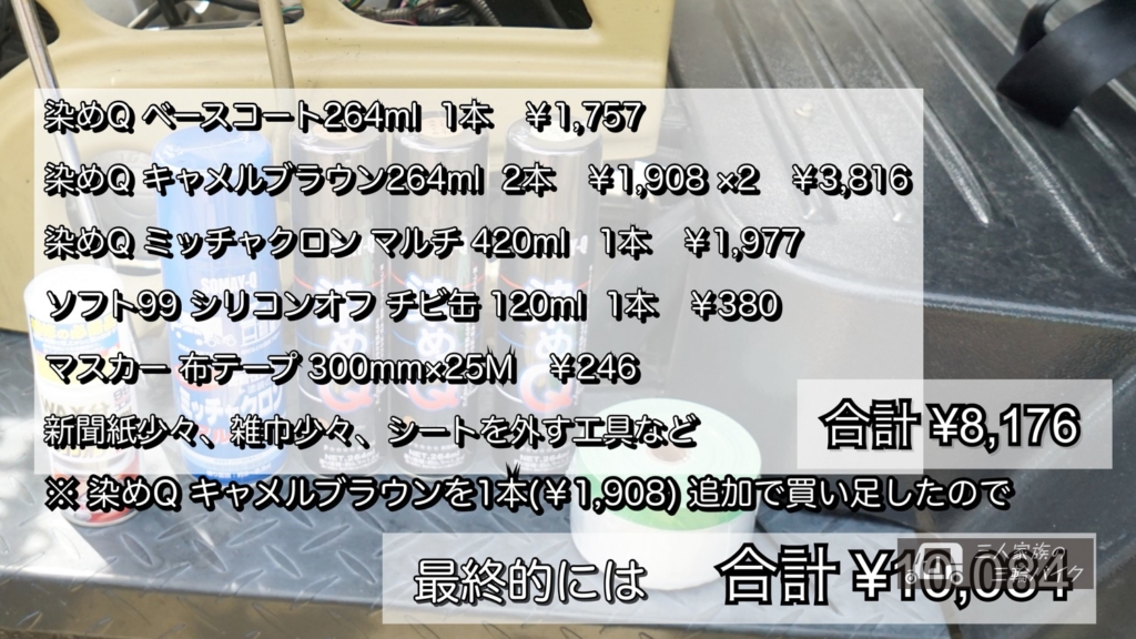 シートカバーを自作する、張り替える等も考えたのですが、有名な『染めQ』でスプレー塗装してみました。